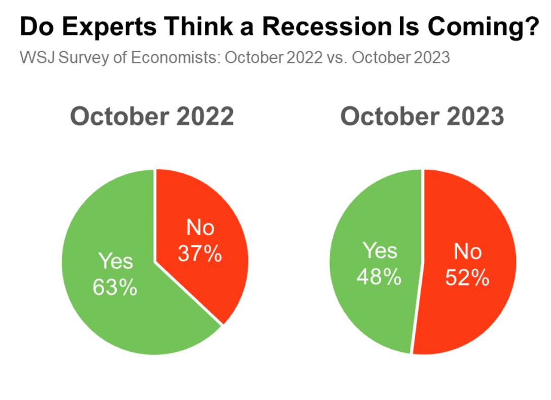 The Wall Street Journal (WSJ) polls experts on this topic regularly. And last year at this time, most of them thought a recession would have happened by now. But as experts look at all the leading indicators today, they’re changing their minds and saying a recession is getting less and less likely. The latest results show that more experts in the Scottsdale and Phoenix Arizona Real Estate Market now think we’re not headed for another recession (see chart below):